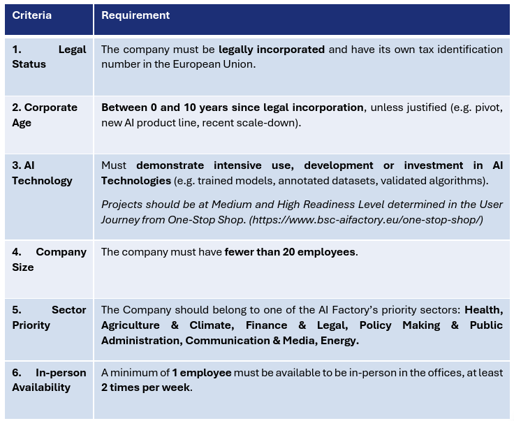 Admission to the incubation spaces programme is selective, based on eligibility criteria and a competitive evaluation process. This programme is designed for early-stage companies that are developing innovative solutions powered by artificial intelligence and are aligned with the BSC AI strategic sectors defined. Dowload the participation rules here: