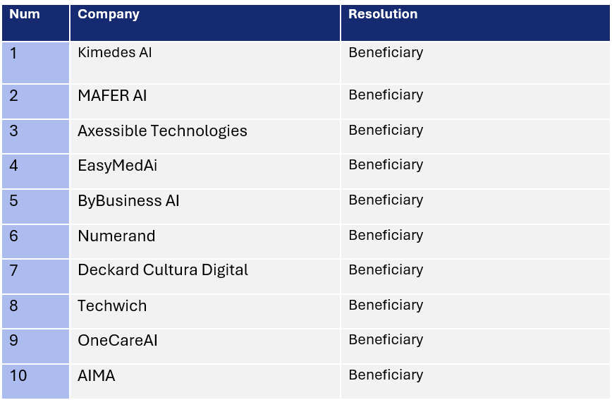 The final resolution of the first call is available on this PDF document. The selected companies are listed in the table that follows: